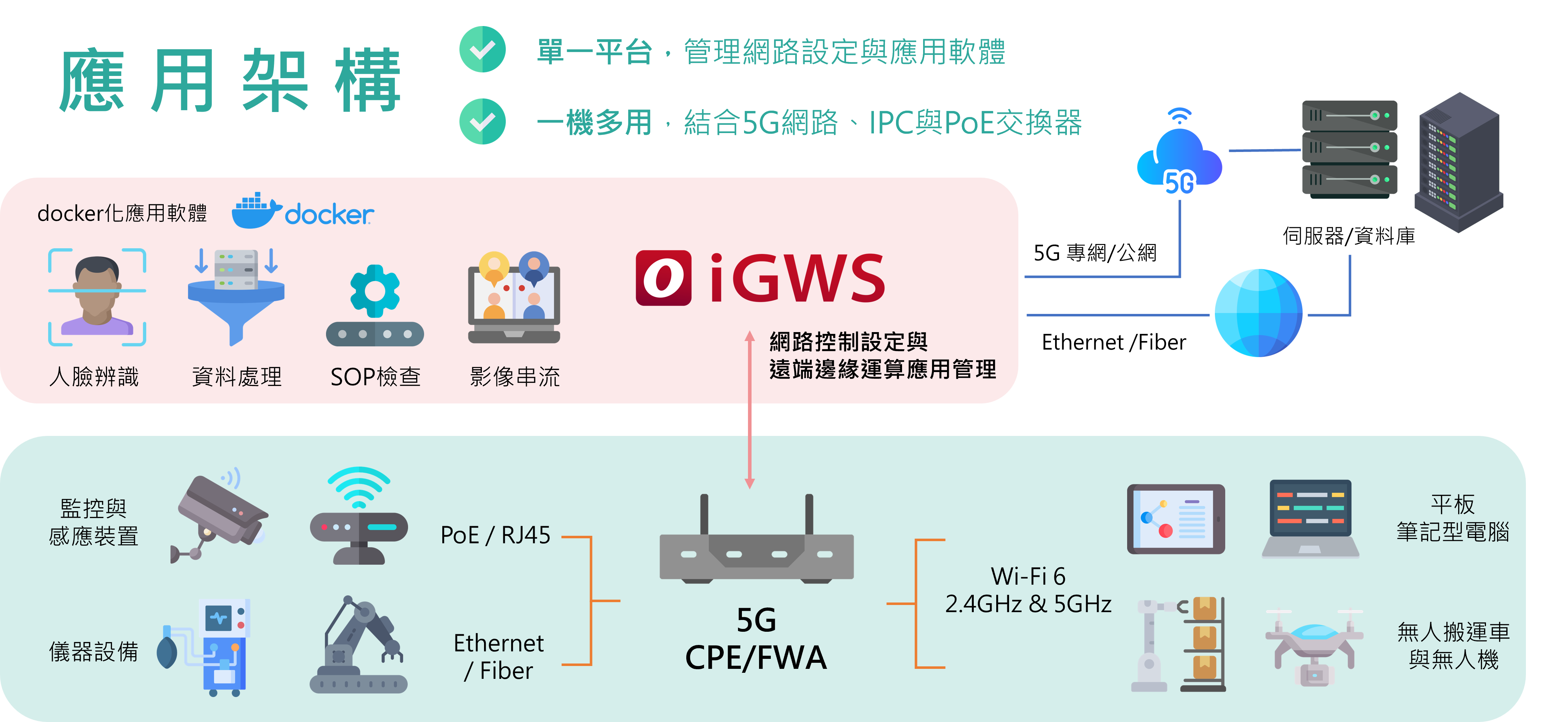 整合多間硬體廠商之5G CPE產品,包含GPU、x86與ARM架構;並具備5G,Far-Edge與PE交換器融合管理