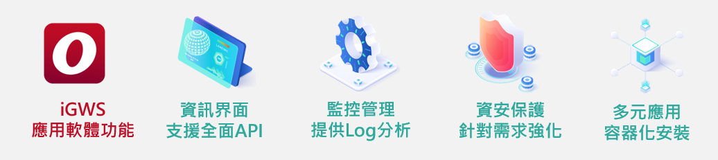 採用微服務架構,可搭載docker標準化容器,提供自選安裝開源軟體與合作廠商之應用軟體